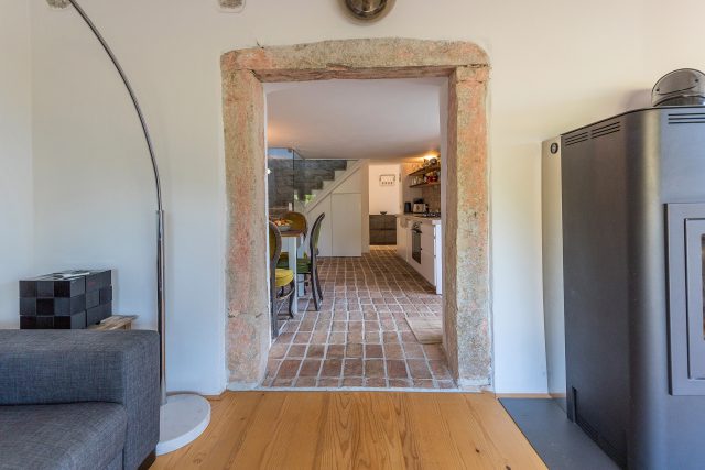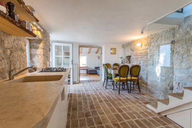 stone kitchen in traditional Istrian stone house with dining area