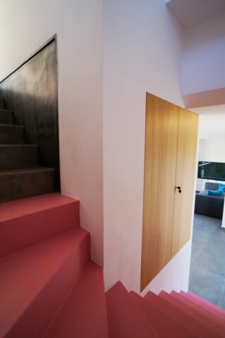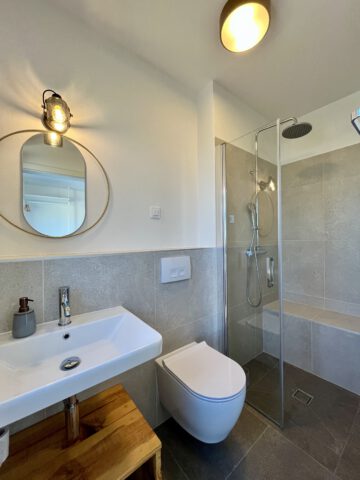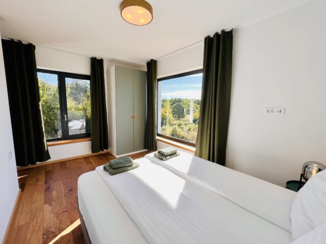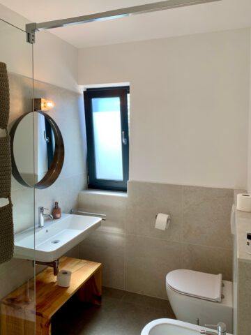 On the upper floor there are two air-conditioned bedrooms with en-suite bathrooms. One offers the view to the green valley and woods, the other to the green flat roof full of mediterranean herbs. Both bedrooms offer comfortable double beds, which invite you to take a nap during the day or to daydream while reading your favourite book, listening to music or the like.