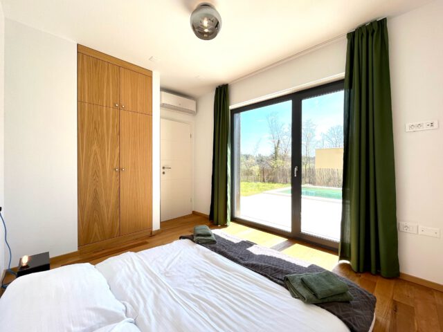 On the ground floor there is also one air conditioned bedroom with a bathroom, with direct access to the garden pool area.
